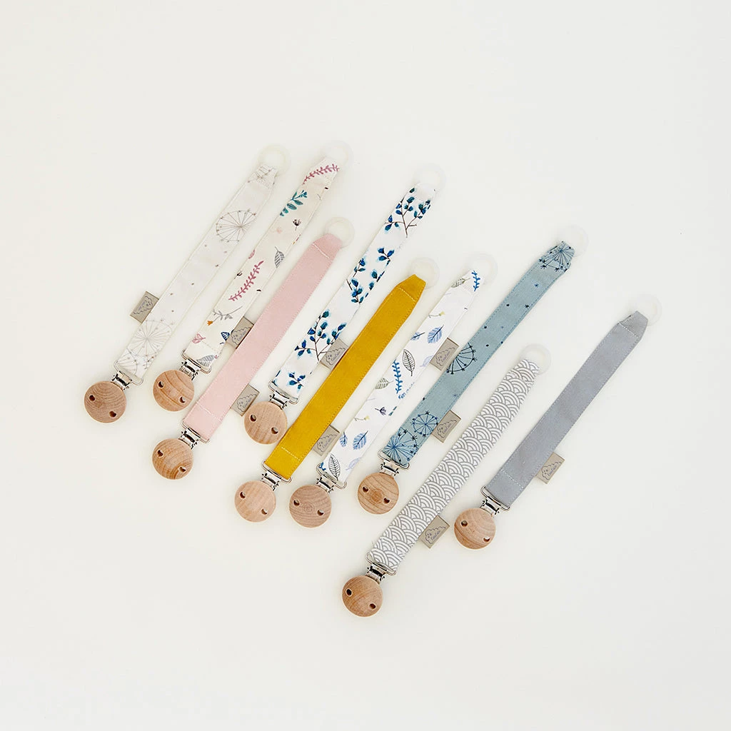 The pacifier holder has a strong 100% natural rubber ring, interfacing inside to avoid twisting and a smart wooden clip with nickel-free metal to attach the holder to the child’s clothing.