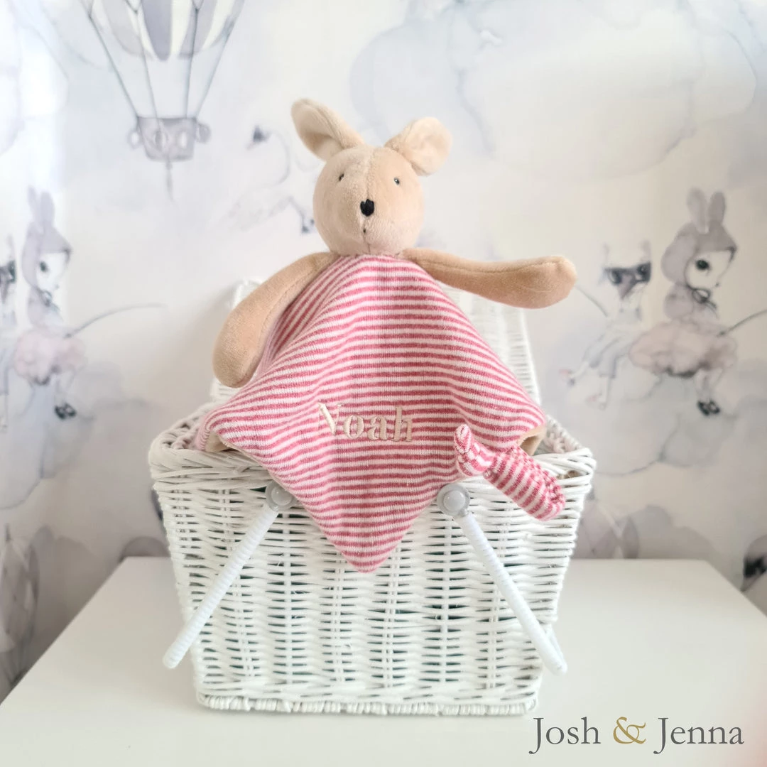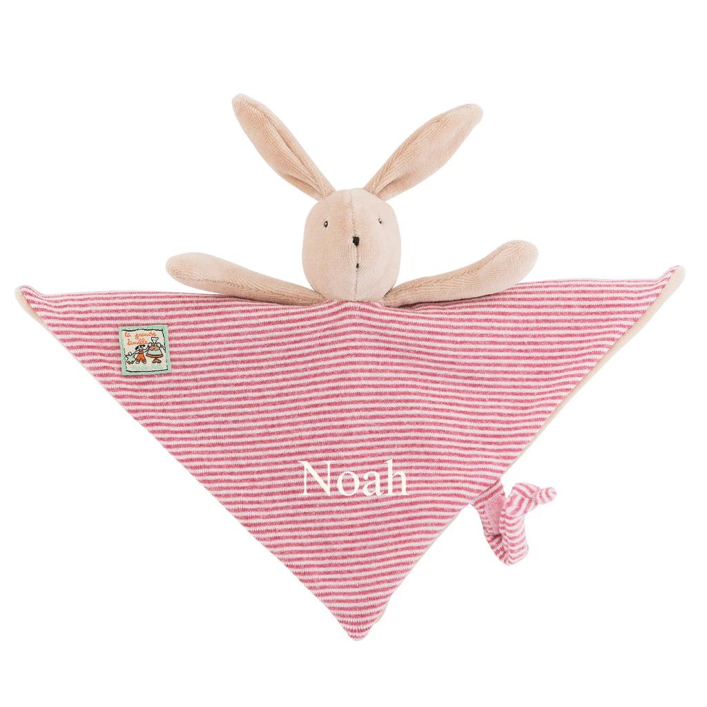 Little Sylvain the rabbit from Moulin Roty, in his striped flannel jersey dungarees is lined in velvet to create a flat comforter easy for baby’s little hands to grasp. It includes a strap to attach a pacifier. Can be embroidered with the child’s first name making it an Ideal new baby gift.