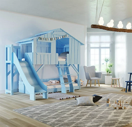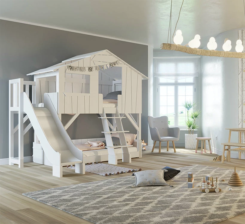 This absolutely stunning Treehouse bunk bed is so enchanting and captivating that it will transform any kids room into a truly magical place for your child to grow up in and now with a added slide they will have endless enjoyment sliding out of bed! This bed is manufactured by Belgian company ‘Mathy By Bols’, who have over 25 Years experience making high quality luxury European furniture.