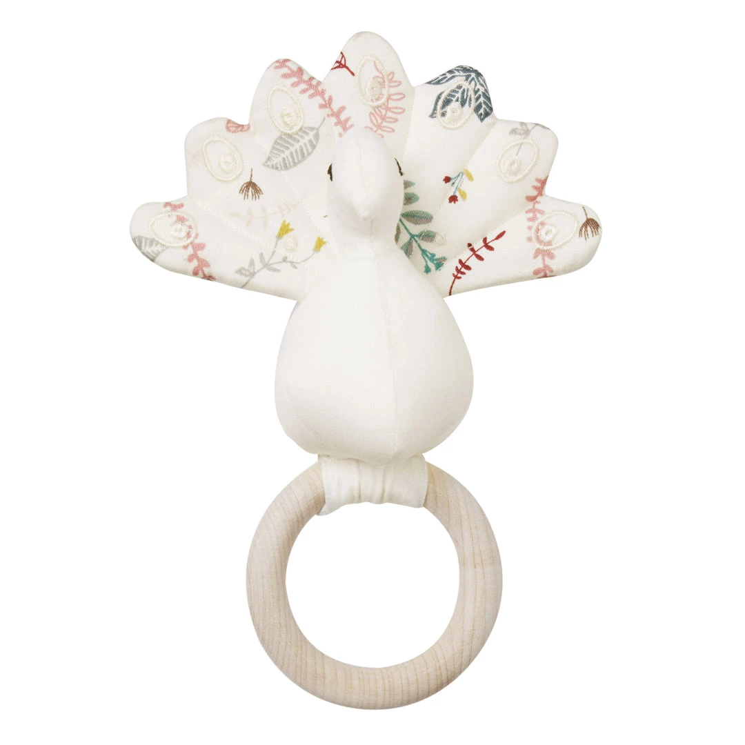 Sweet rattle shaped as a peacock. The small peacock has beautifully made embroidery.