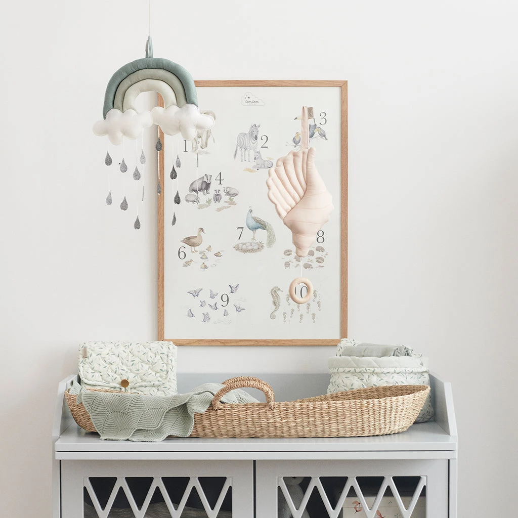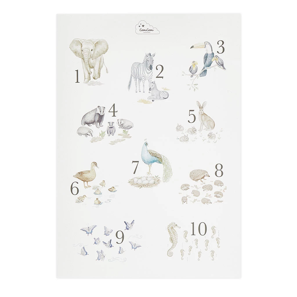Learn to count to 10 in a playful way with this beautiful and educational poster. The poster features hand-drawn poetic illustrations of recognisable animals and their cute babies. The combination of numbers and drawings stimulates the child’s natural curiosity and eagerness to discover. The Number poster allows the child to become acquainted with the numbers in a homey setting and offers the perfect opportunity for contemplative and creative moments together. The vintage aesthetics with romantic water colour drawings in soft tones will bring classical charm to any nursery. The A2 poster is made in Denmark from FSC Mix-certified paper.