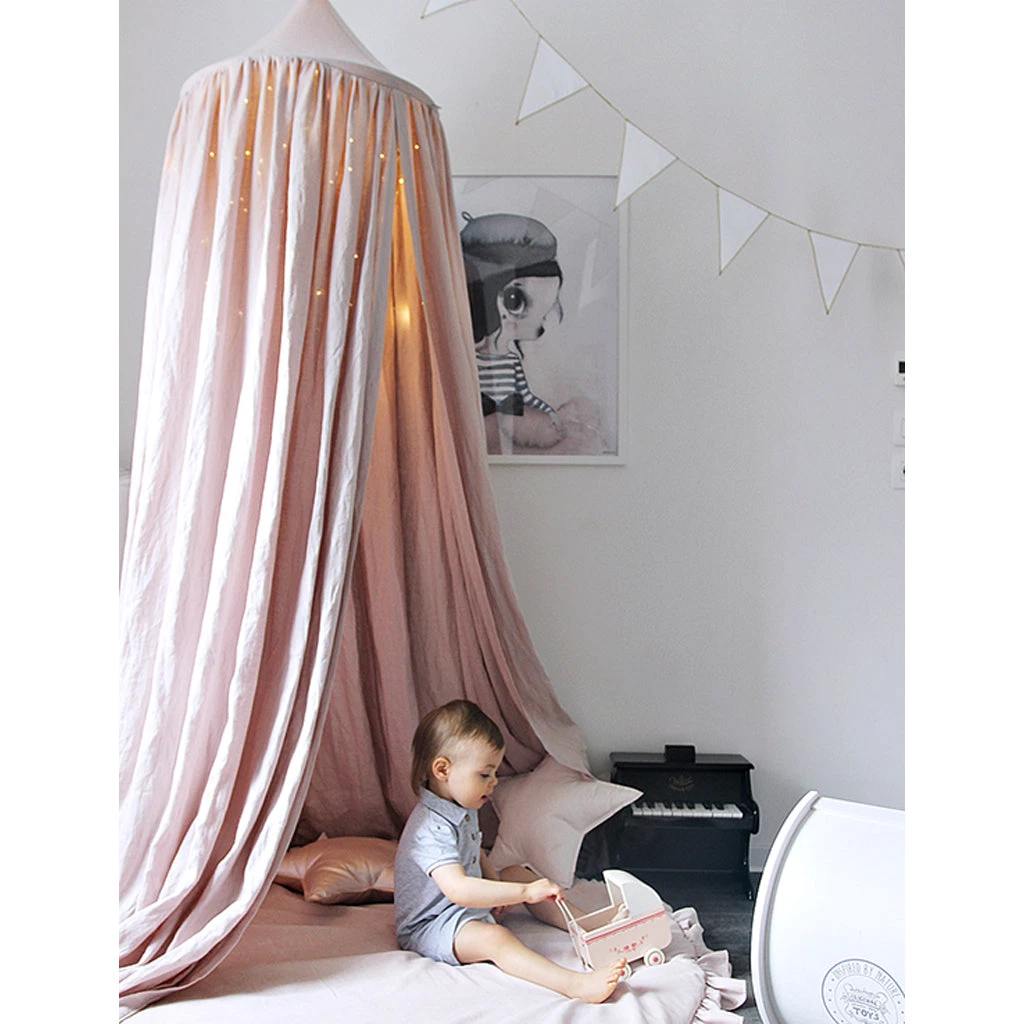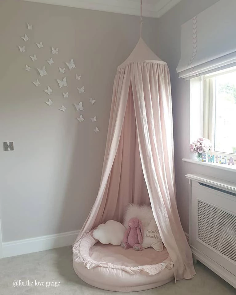 The canopy is made from a high quality Linen material and its simple shape and flowing design will fit perfectly into any nursery or kids room theme. Inside the canopy itself, there is a loop to hang internal decorations such as a mobile or a lamp.