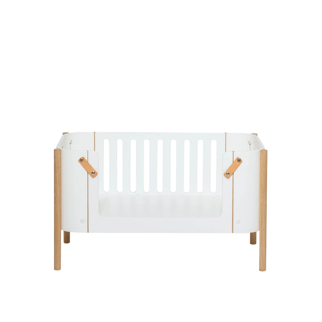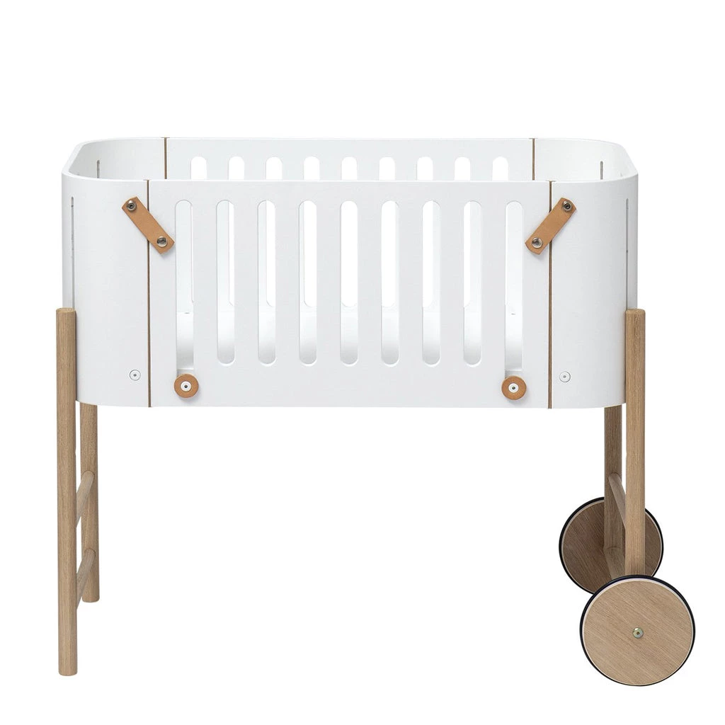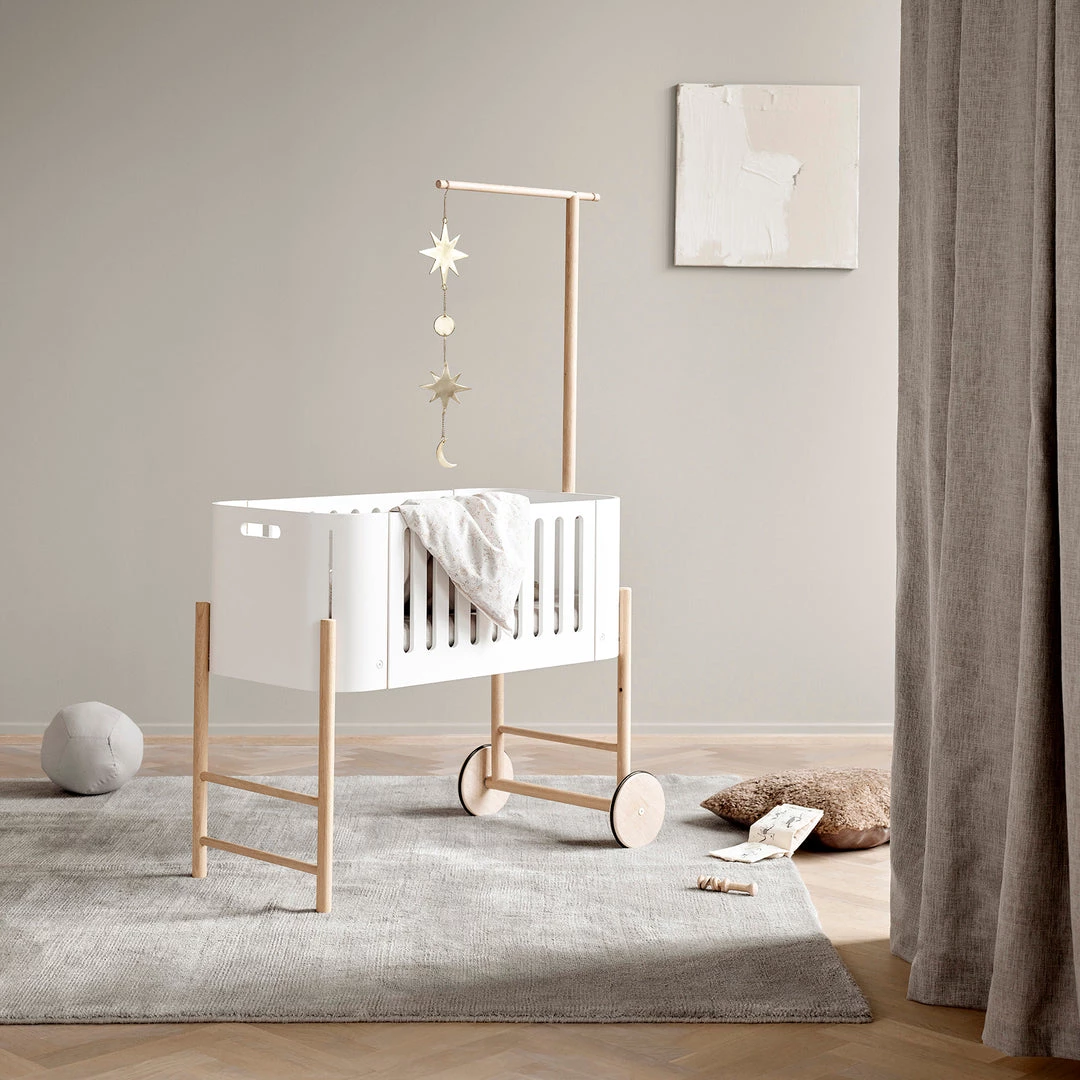 The Oliver Furniture Wood co-sleeper is a beautifully designed baby bed, which bears both the baby’s and the parent’s need for being close and snug in the first months. At the same time the design accommodates the practical context of nursing and caring, and it ensures the necessary sleep for both child and parents: by lowering the front side of the bed, it can easily and securely be coupled to the parents’ bed. This way the baby experiences the essential closeness during the night, while the parents get optimal sleep conditions because their baby is lying safe and close-by. Wood co-sleeper creates just as safe a base for the baby during the night as it does in the day, where the bed, with both sides up, functions as a cosy cradle. The co-sleeper, which has rubberised wheels, can easily and quietly be wheeled from room to room. With its stylish expression and delicate proportions, the bed beautifully adapts to the existing interior.