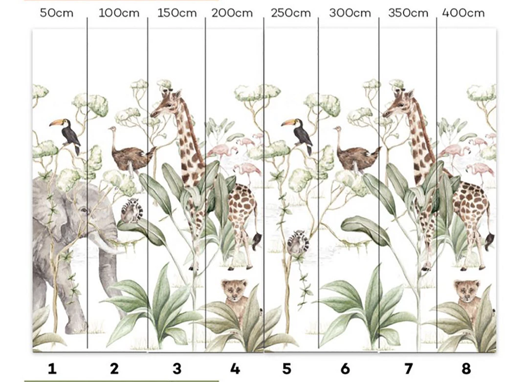 The pattern is divided into 50cm wide panels. The animals are arranged so that their heads are centered in the panel and the same distances from each other. Therefore, when cutting through the sides, their is no possibility that the giraffe’s head will cut in half or that the toucan will lose its beak. Evenly distributed animals also help adjust the wallpaper to the dimensions of the wall.