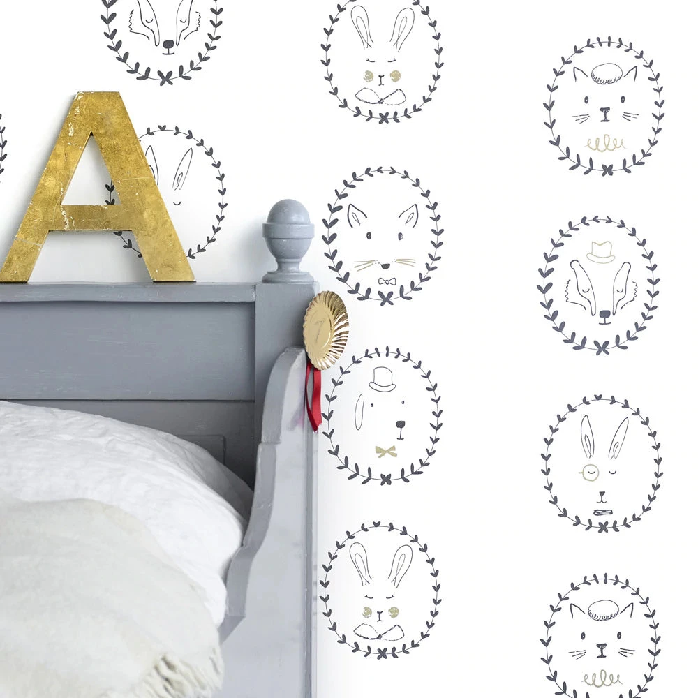 Inspired by traditional ancestral family portraits from Hisbou Home, this design features delightful portraits of animal characters framed in olive leaf wreaths. Meet Great Uncle Algernon, the monocled hare and Aunt Maude, the cat with the pillbox hat amongst others.
