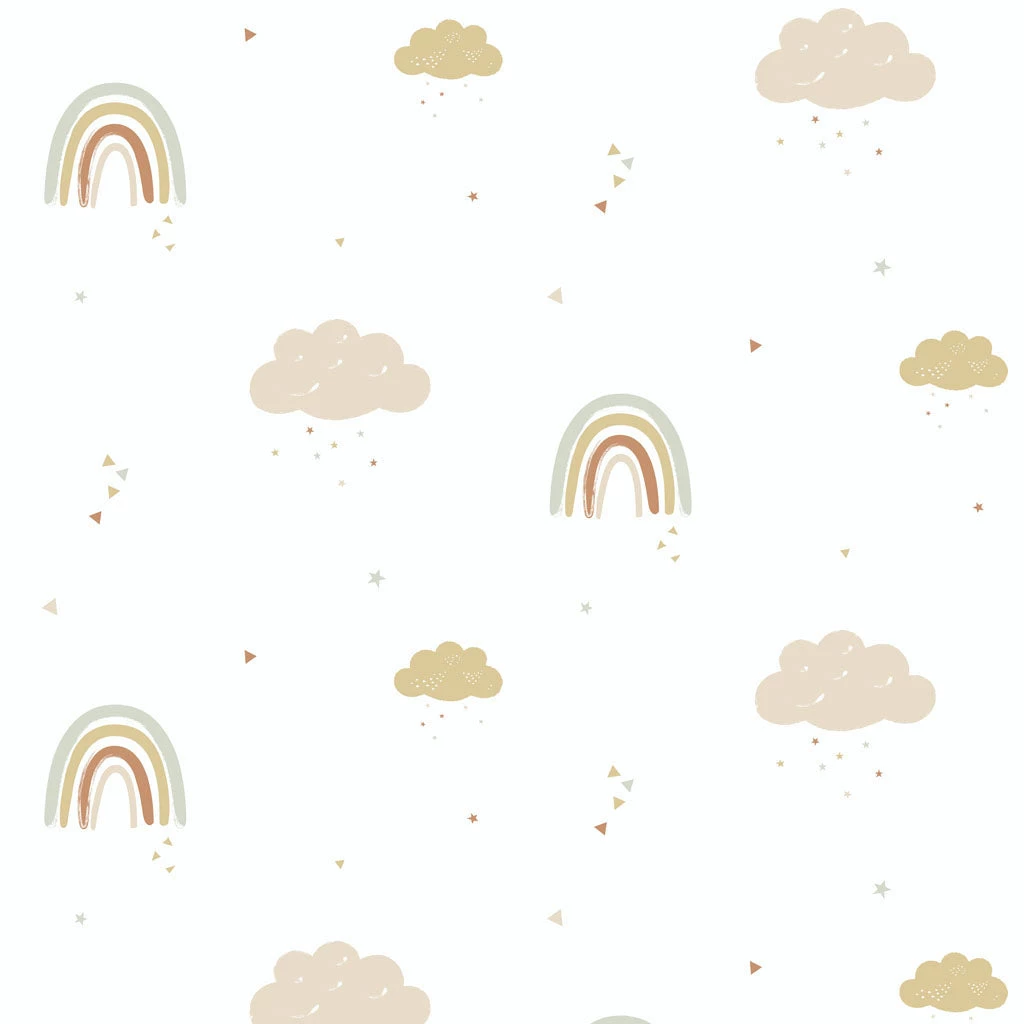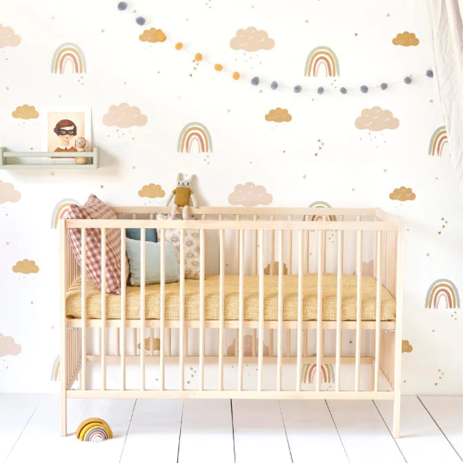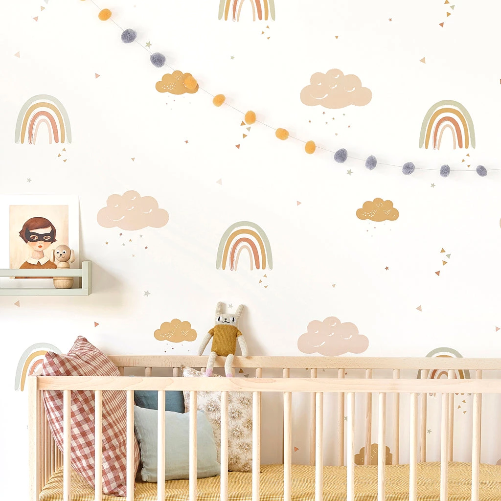 This gorgeous Rainbows wallpaper from Hibou Home will transform your baby’s nursery, child’s bedroom or kids playroom into a happy and joyful place. The wallpaper features sweet rainbows & Clouds in sophisticated shades of mustard, rose, brick and sage green it will transform a nursery, bedroom or playroom into the most stylish of spaces!