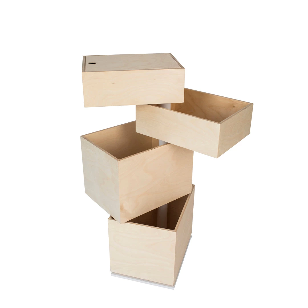 The In2Wood carousel combines a good looking design and functionality. This clever innovative storage system with 3 storage boxes turns like a carousel at 360 degrees. The storage boxes made out birch plywood are easy to access, even the kids will having fun to clean up their toys. The Carousel is solid and has a stable construction made out lacquered steel.