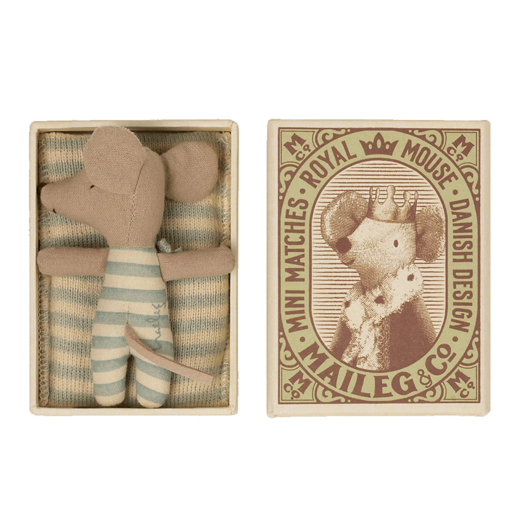 This Baby Boy Maileg mouse is ready for hours of play and sleeps tight in her little matchbox. The clothes and bed linen are made of soft fabrics with unique prints and beautiful colors.