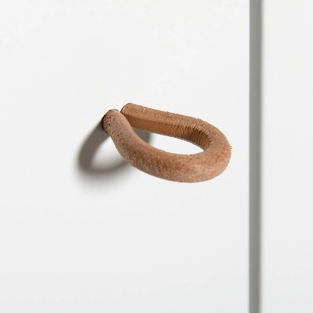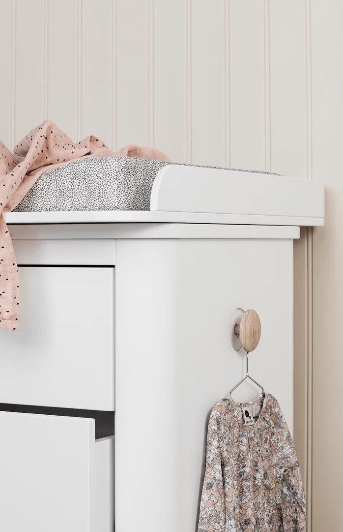 The wood nursery dresser has rounded edges on the back face as well, making it visually stand out and therefore distinguishing it from the wall. The 6 solid and spacious drawers run effortlessly on high quality rails and a special ‘soft lock’-function dampens the closing of drawers and doors, so small fingers won’t get pinched. The sides of the dresser are designed with integrated, rounded hooks for hanging decorative objects and are a useful feature on busy days where things should be quickly and easily accessible to hand. The hooks and footings of the dresser are made from solid oak or white lacquered birch while the handmade leather pulls add a real touch of class and a traditional feel to the dresser.