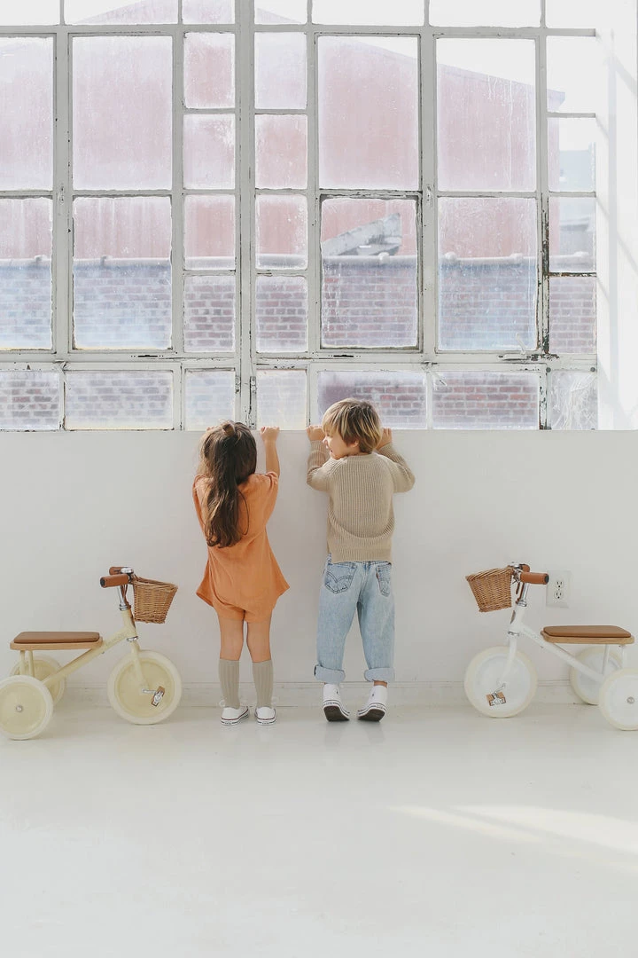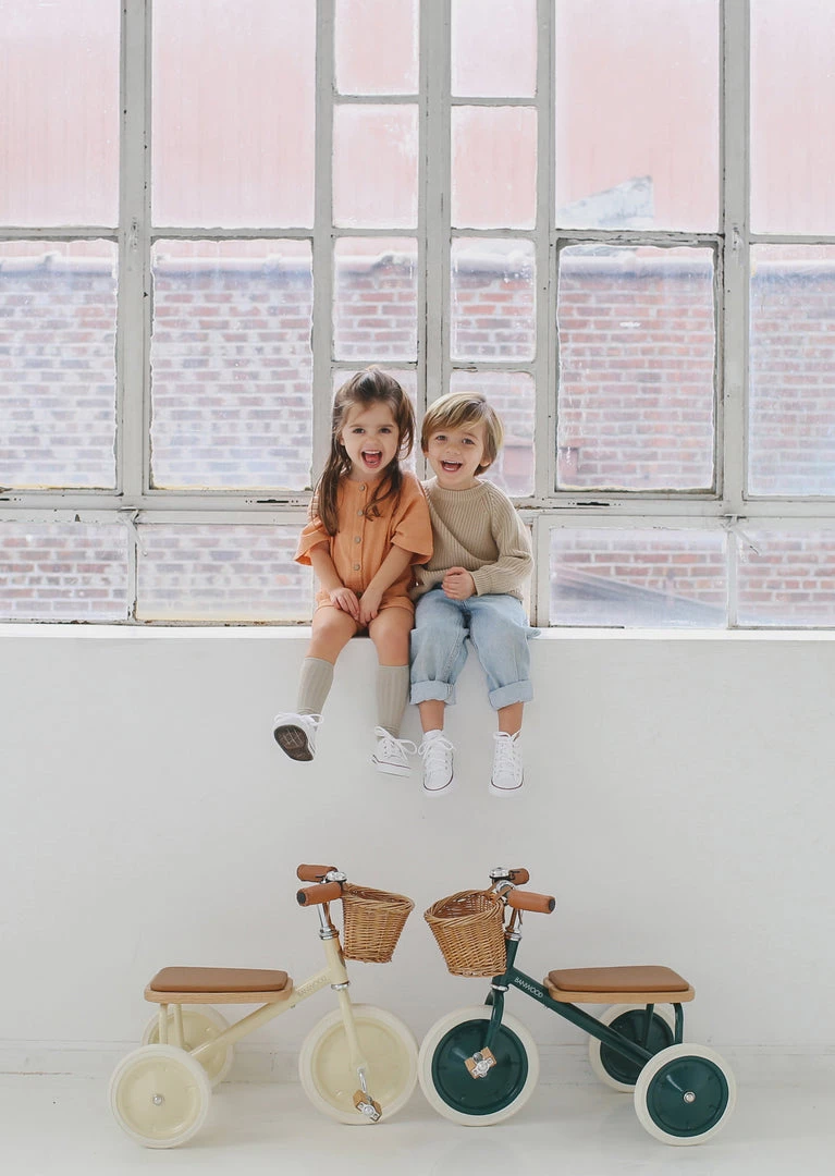 Featuring a soft padded oak seat, vegan leather details, wooden oak pedals and a cute wicker basket in front for bringing along their favorite toys