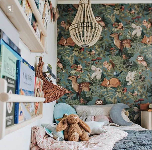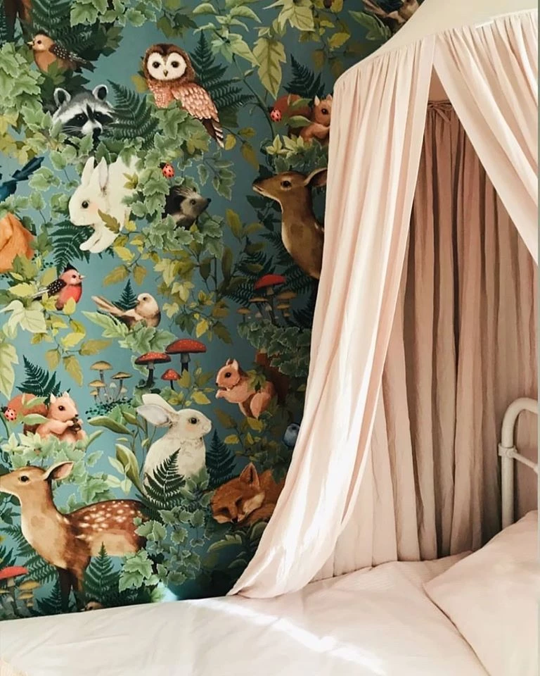 The wallpaper is printed on non-woven paper and has an extra surface for both quality and functionality. Thanks to their special surface, the wallpaper can be wiped down, so it stays clean and beautiful. See details for measurements! This Woodlands in dust blue is a unique work of art featuring bunnies, deer, foxes and birds woven among an array of greenery that you would find on a forest floor.