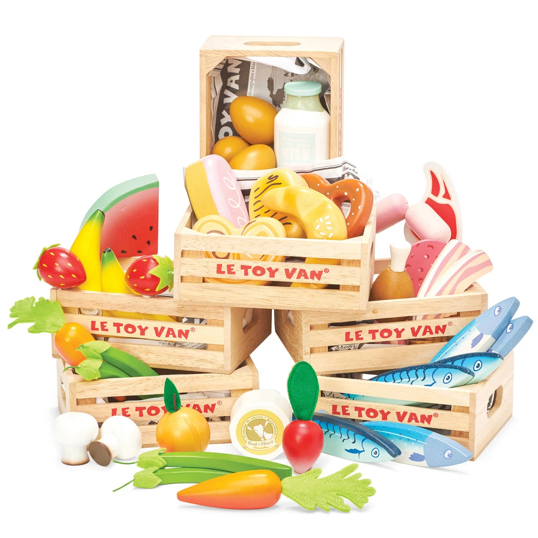 This Le Toy Van food crate comes with Six glittery wooden fish in a crate.