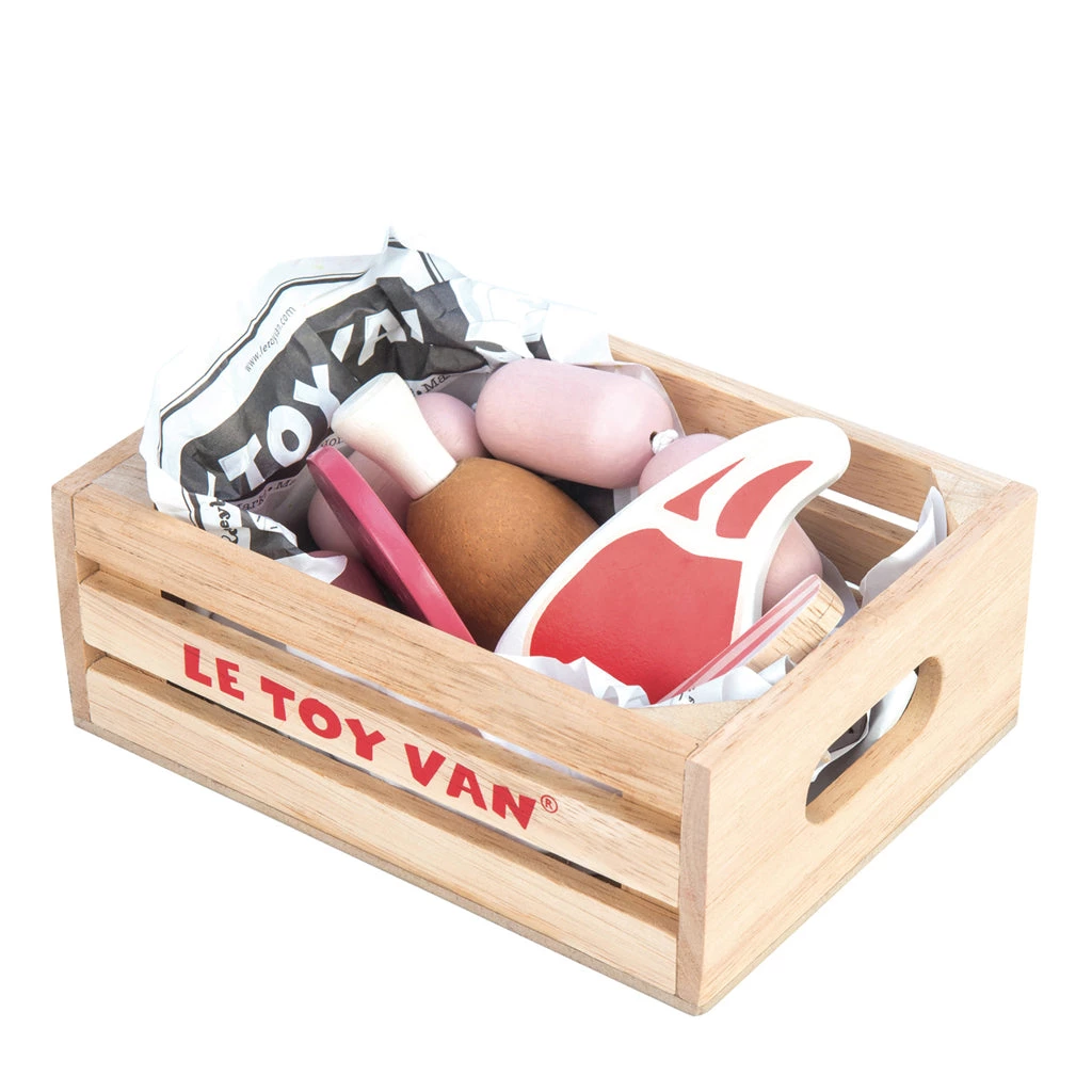 A wooden crate complete with wooden sausages, steak, chicken, salami & bacon pieces.