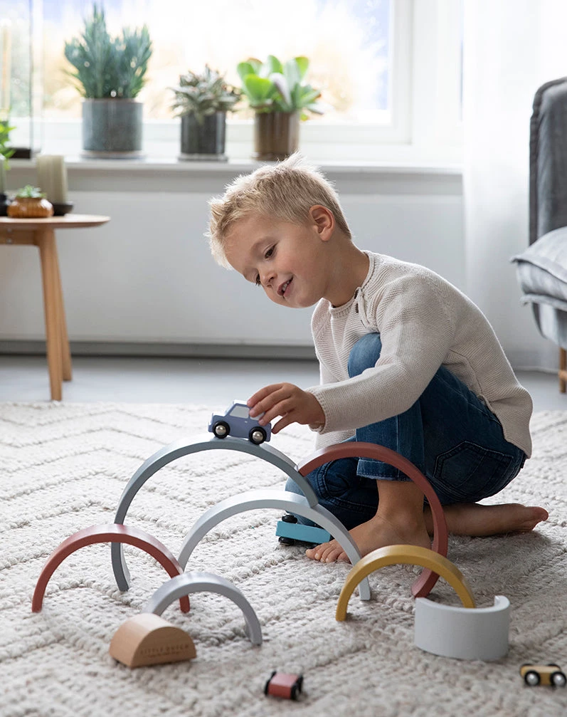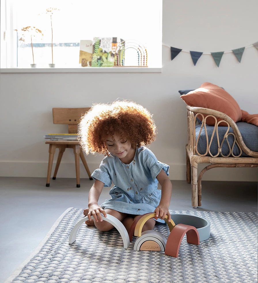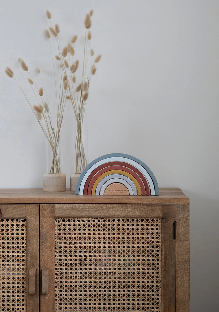 The Little Dutch wooden rainbow is a wooden stacking tower in the shape of a beautiful rainbow. The rainbow looks great in a child’s bedroom and is fun to play with. The rainbow consists of 8 arches that fit on and in each other. Your child can use these semi-circular shapes to play and learn and to make all kinds of creations by using their imagination. The arches can also be used as a train tunnel, a house for little dolls or mountains for little cars.