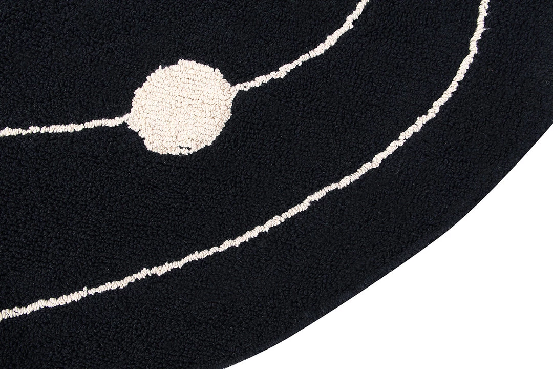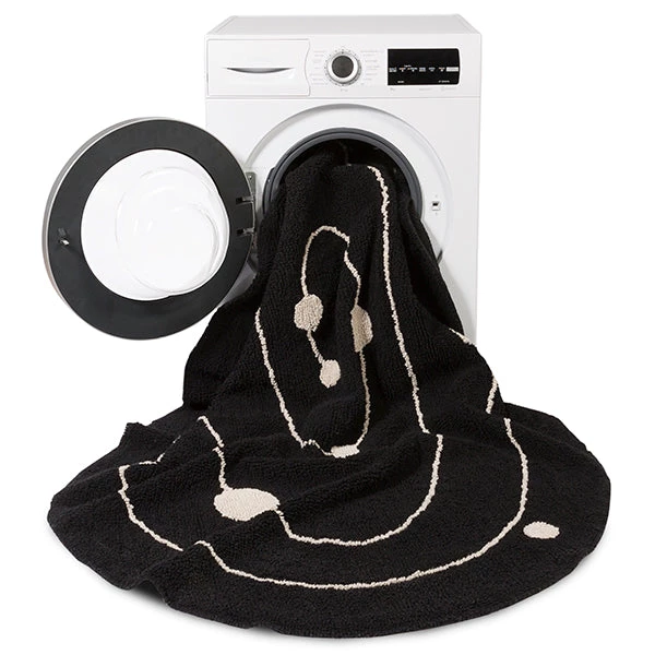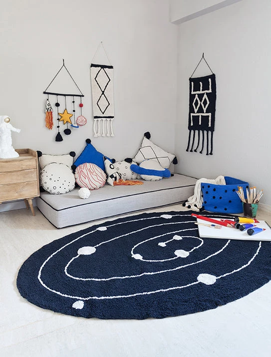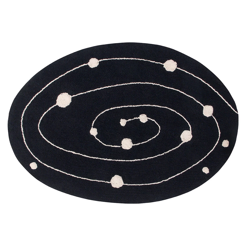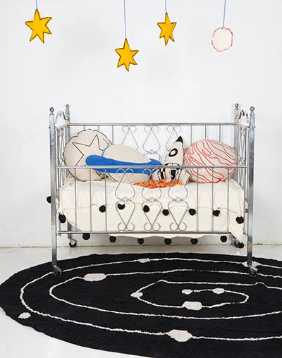 The Galaxy collection by Lorena Canals comes as one of the great inspirations of the season – the imagination is limitless! The Milky Way black rug is 100% cotton and washable in a domestic washing machine (weight: 9 kg). Oval in design, a spiral in the form of the Milky Way and the various planets are traced in a natural cotton colour on a black back ground. It is the first Lorena Canals children’s collection in black and natural colours, a trend that suits children’s bedrooms, whether girl’s or boy’s, and living rooms, dining rooms and bedrooms. Handmade and they use only natural dyes make it safe and being cotton, it is light, soft and pliable.