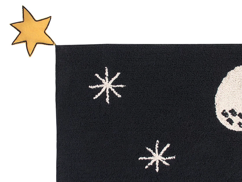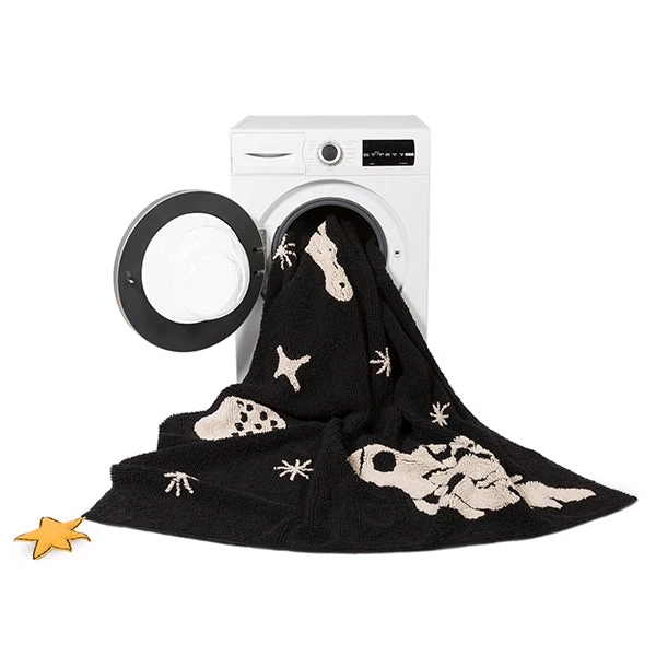 The Galaxy collection by Lorena Canals debuts as one of the great inspirations of the season – taking us as far as the moon and stars! The Universe rug is 100% cotton and washable in a domestic washing machine (weight: 9 kg). Rectangular in design, planets, stars, meteorites and rocket are depicted on a black background, all in the colour of the natural cotton.