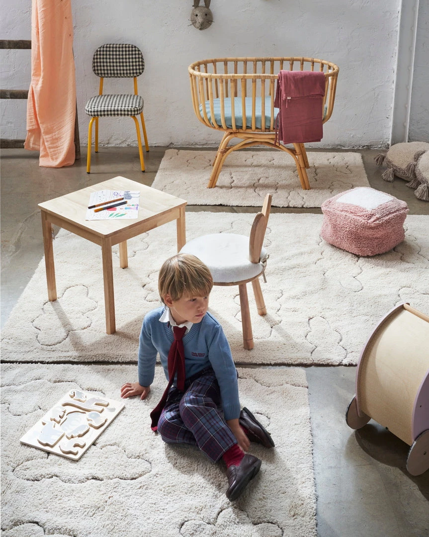 Lorena Canals Best selling Clouds rug now comes in a new, upcycled version. The clouds’ silhouettes are subtly debossed on the surface, allowing for the canvas base to appear partially exposed.