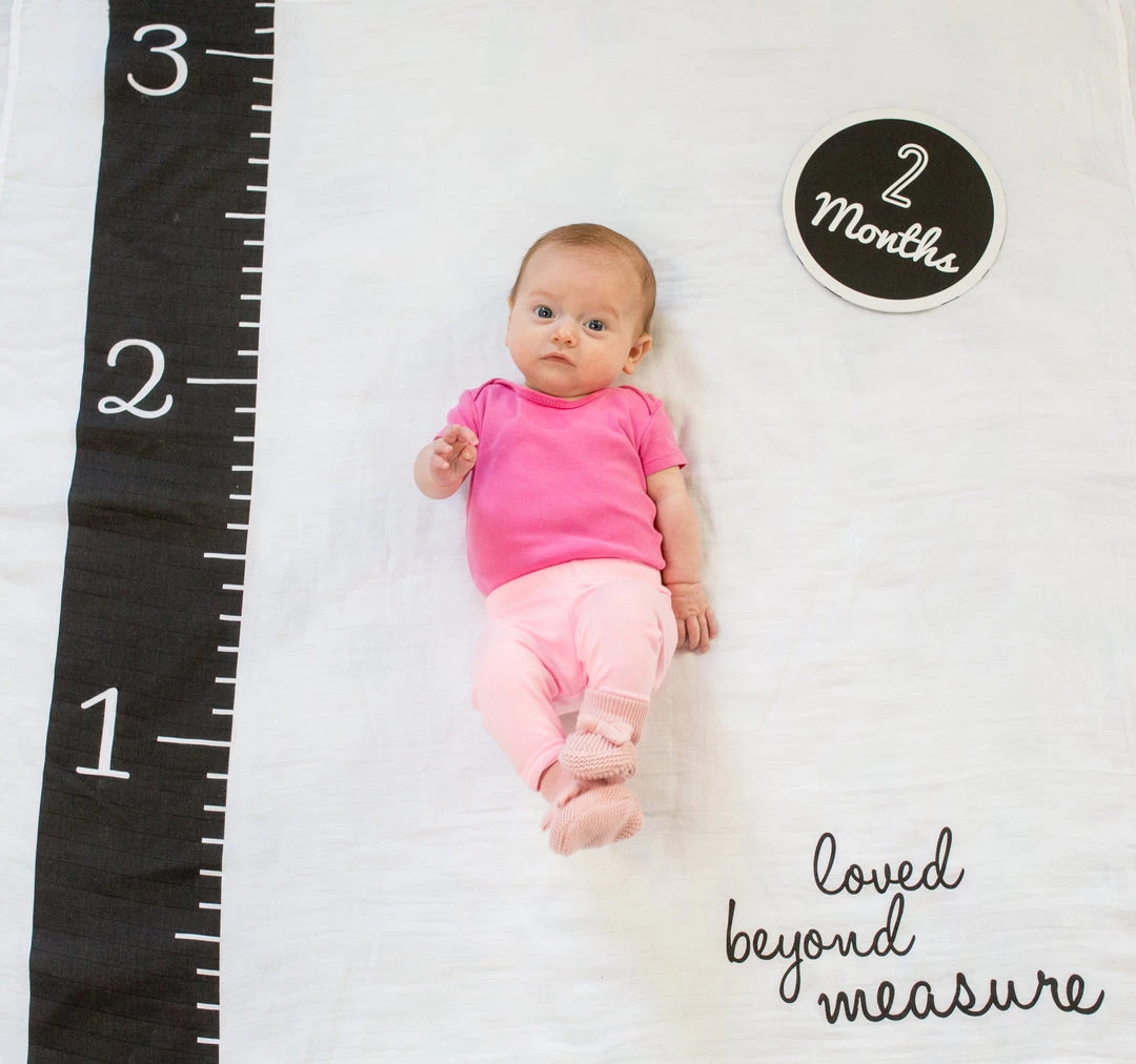 Includes: 1 large muslin blanket + 7 double-sided cards with 14 milestones.