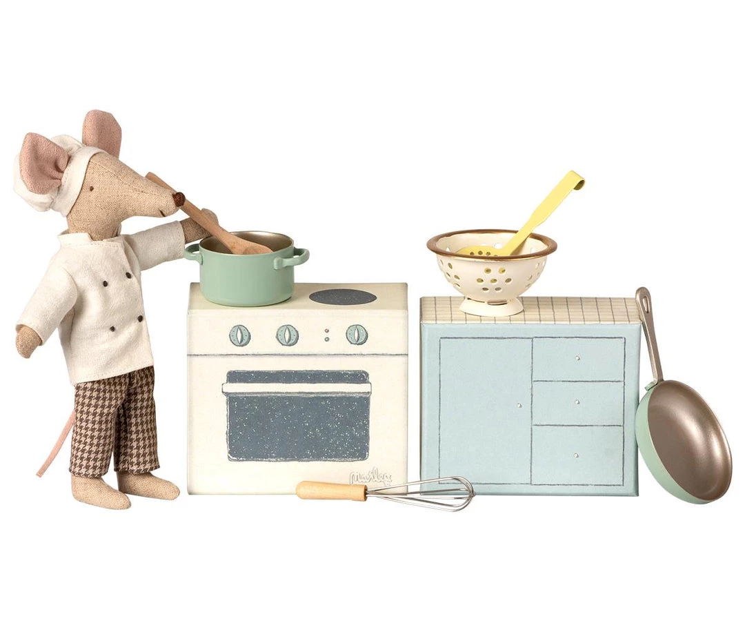 Playful stove box opens up to reveal everything you need to cook a perfect imaginary dinner for your Maileg friends. The set includes a pot, pan, colander and utensils.