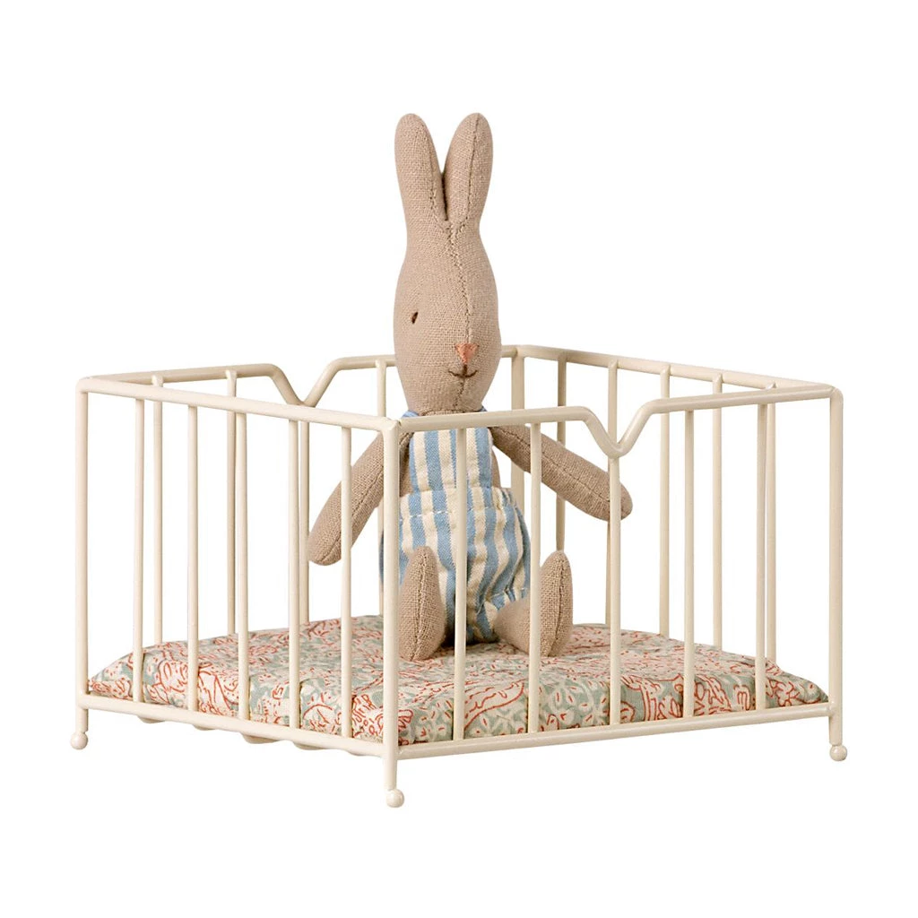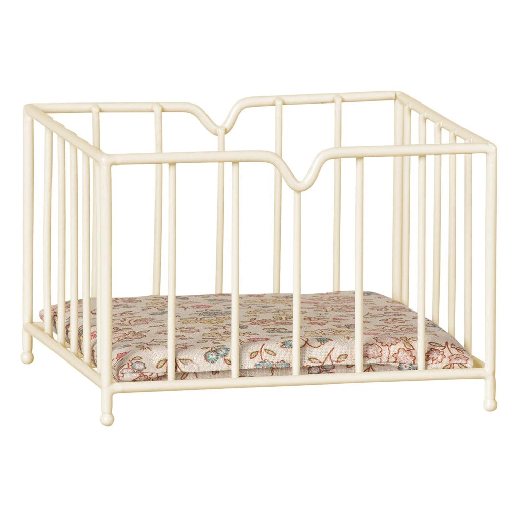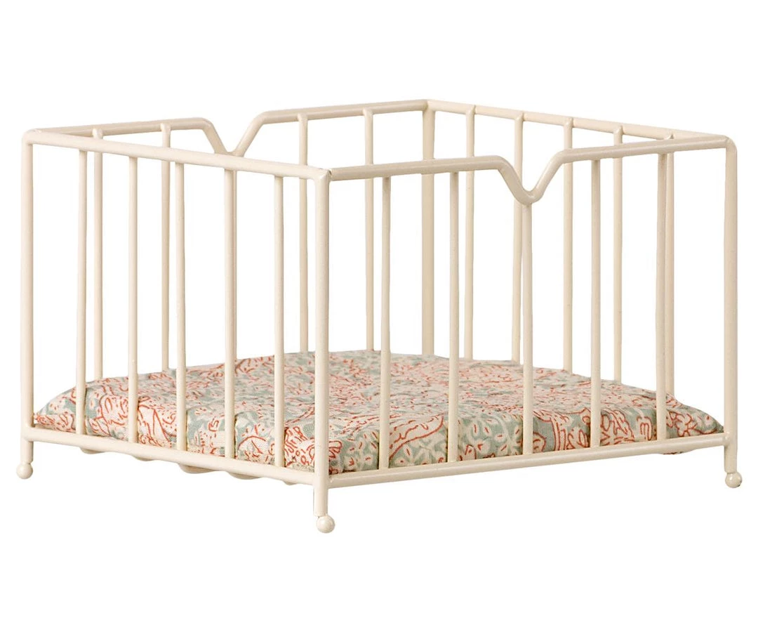 A cute little playpen for all your Maileg baby mice or Micro bunnies to play in. The playpen is made from an off-white painted metal and comes with pretty floral mattress to keep your baby mouse or rabbit comfy and safe.