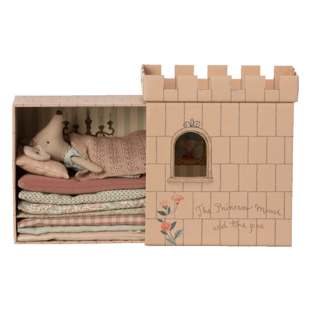 New AW19 Maileg Collection – Once upon a time play set inspired by the famous fairy tale Princess on the pea. This Maileg big sister mouse set includes a paper castle with mattresses, a pea and a princess mouse.
