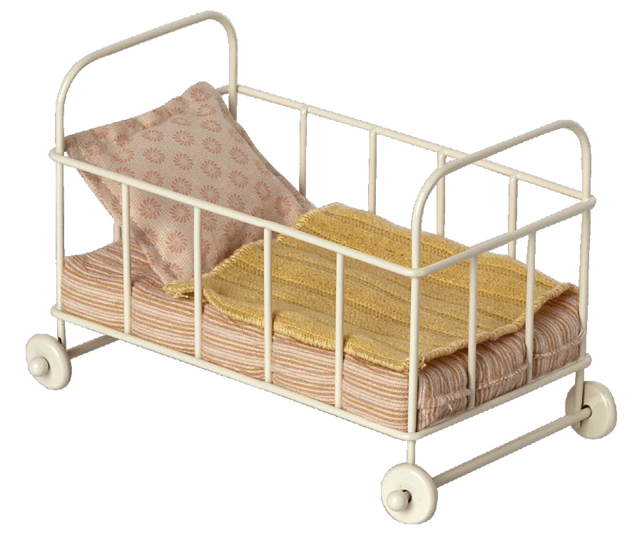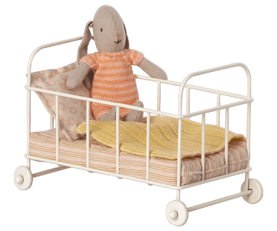 Your baby Maileg Mice & bunny will sleep safely tucked up in this cot made of metal which and comes with a mattress, blanket and pillow. You can tuck in your micro sized friends as well as brother and sister mouse. Sleep tight cute friends!