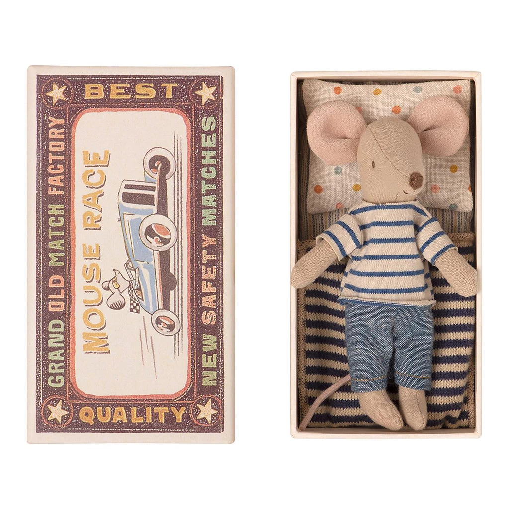 The Maileg big brother is ready to cuddle in his match box with his striped soft bedding . New for the 2021 collection this adorable mouse comes wearing a striped top and denim shorts ready for long summer days
