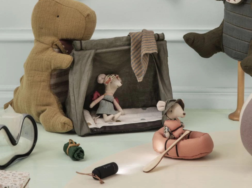 This little rubber boat is made of fabric and comes with life west and paddle as well. It is not water proof, so you have to imagine it floats on the water. Mouse not included