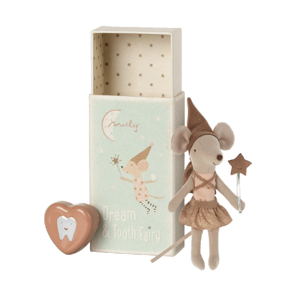 At night the Maileg tooth fairy spreads fairy dust, collects teeth, brings treats and makes sure you have sweet dreams. Dressed magically in a gold tutu with leggings, a shiny hat and a sparkly backpack – includes matchbox and rose coloured metal tooth box