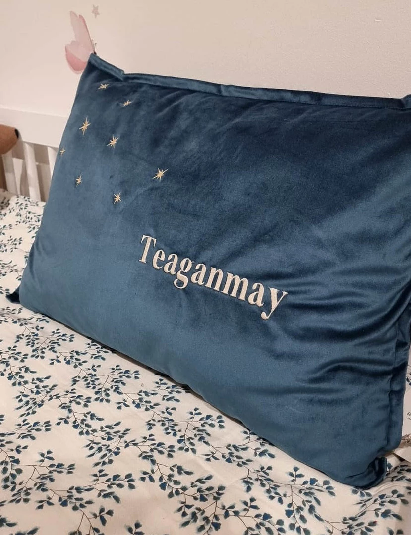 This beautiful decorative pillow in teal is made of a luxuriously soft velvet & decorative with gold embroidered stars and can be personalised with a name.