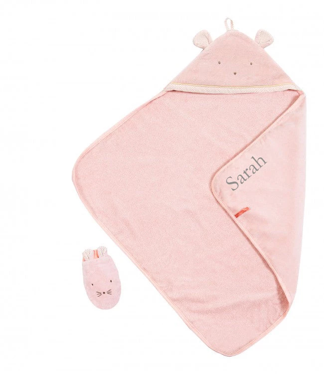 Bath cape with matching little mouse mitt made from powder pink velour with ears on the hood, trimmed with gold-coloured edging and glittery dotted cotton voile to wrap baby in softness. It can be embroidered with your child’s name! Ideal as a newborn gift