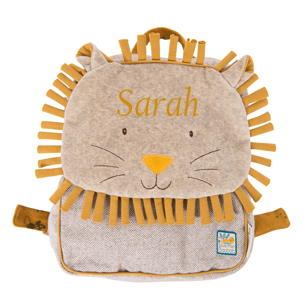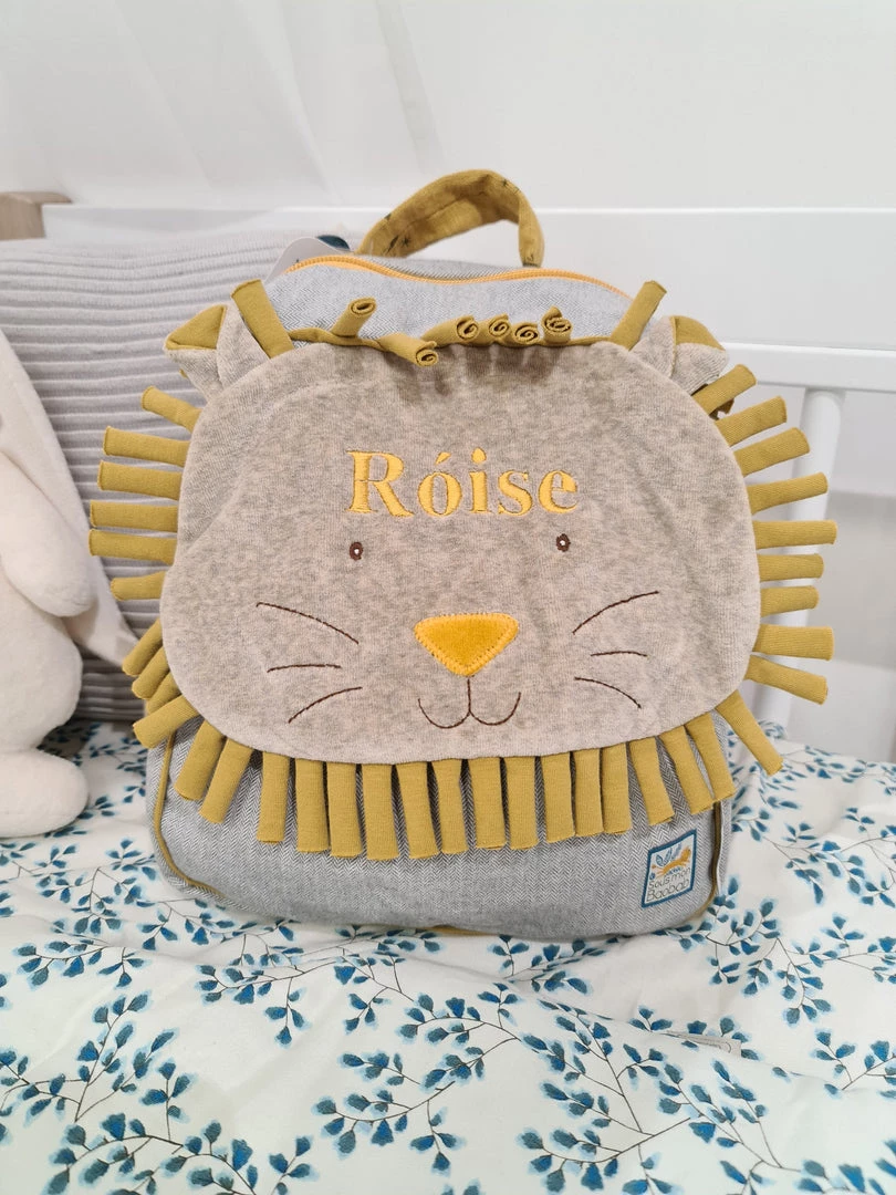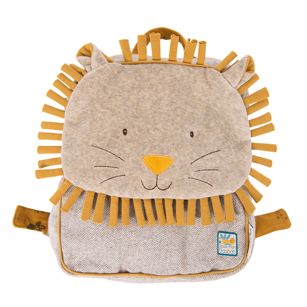 This adorable Lion backpack from Moulin Roty is made from herringbone fabric and marl towelling velour, our favourite Moulin Roty lion’s face features on a strong and practical backpack with a zip fastening!Â