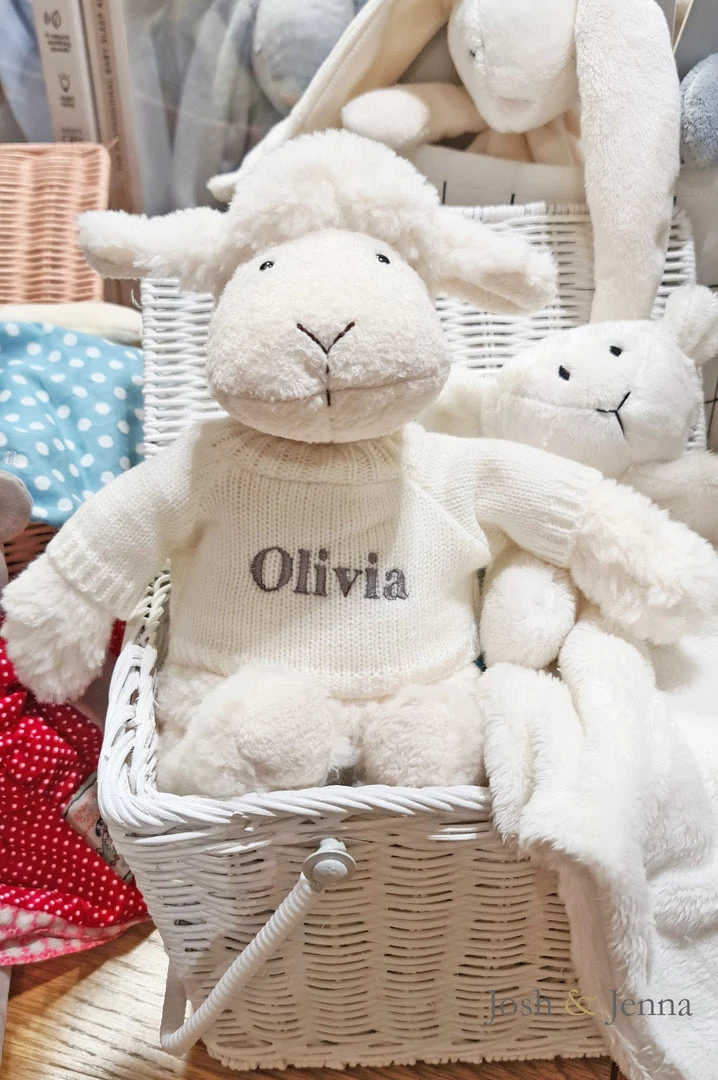 This adorable lamb is beautifully soft and tactile, making a perfect first baby gift and now comes with its very own personalised knitted jumperÂ