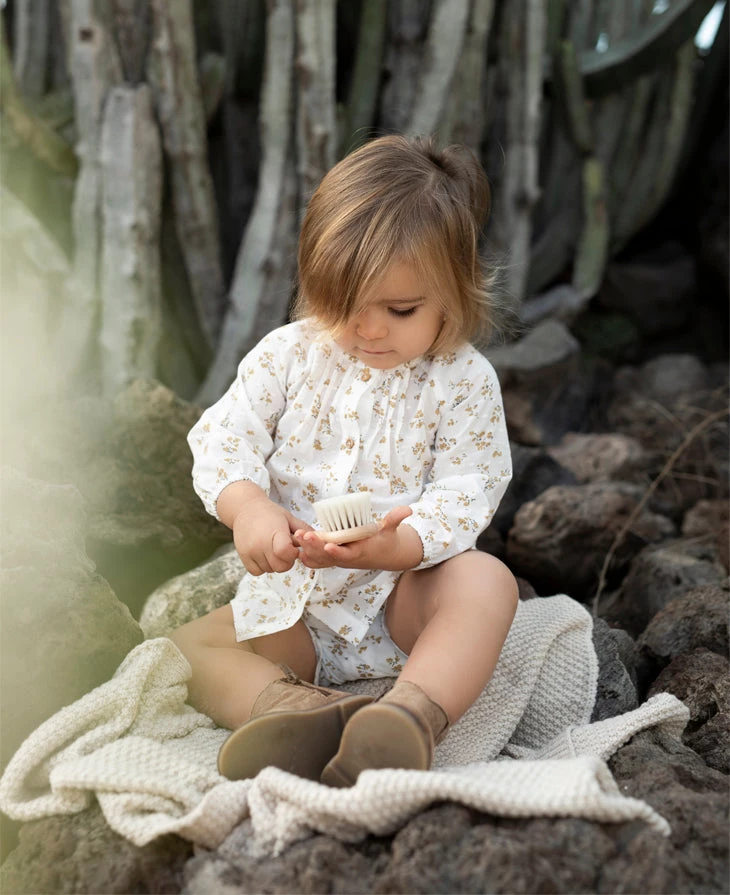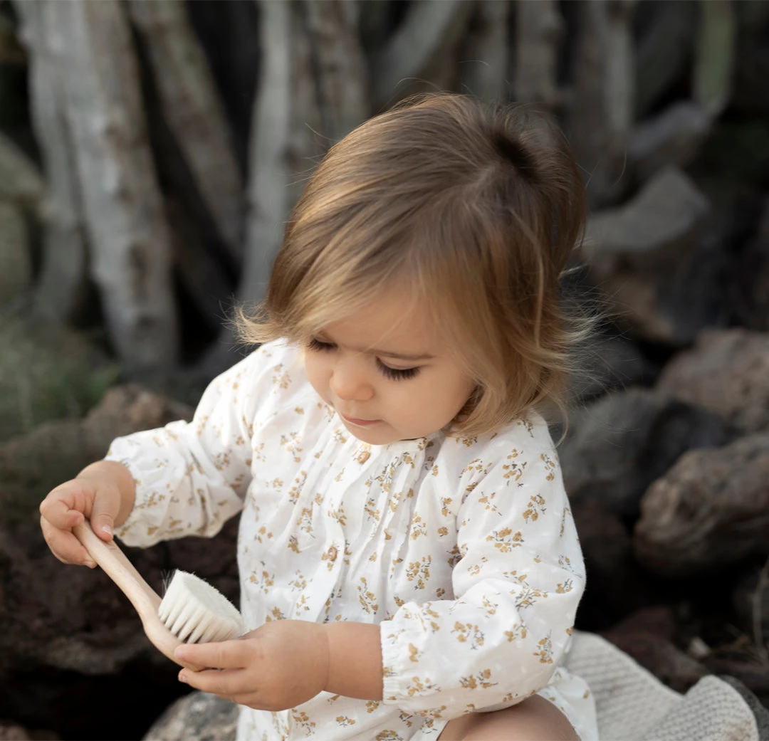 This incredibly delicate, natural hairbrush for children is made of white goat hair and has a beech wood handle.
