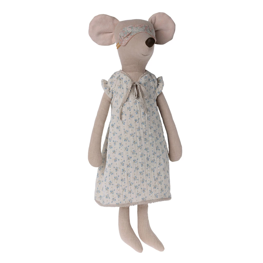 This adorable maxi mouse is dressed in a nightgown and has a sleeping mask to ensure a good night`s sleep