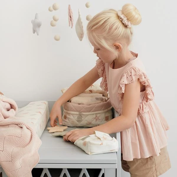 The quilted storage baskets from Cam Cam are practical for keeping everything organised around your changing table, in your nursery, or at the bathroom. The baskets are made of OCS certified organic cotton, and have a pretty quilting. The outside lining is printed in signature Cam Cam Seabed natural print and the edge can be folded down to show the lovely pink lining