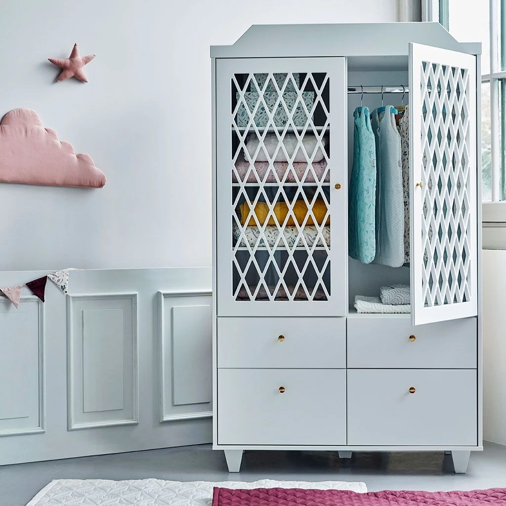 The wardrobe is practical with four soft-close drawers, four shelves and a clothes rack for hangers. The characteristic Harlequin pattern at the doors creates a beautiful display of your, or your children’s favourite things.