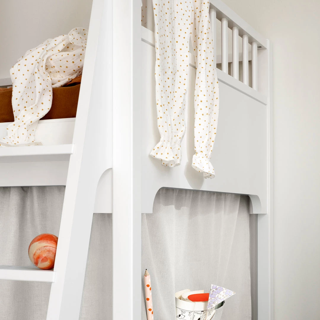 The design is classic, Nordic and of high quality. The expression is very light and simple yet very solid and safe in the design. The new low loft bed is flexible and can be converted concurrently with the child´s development. The curtains for the low loft bed can be purchased in different designs.