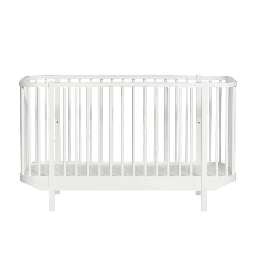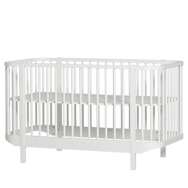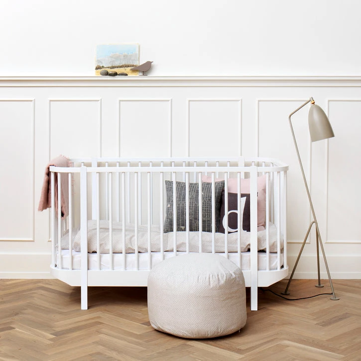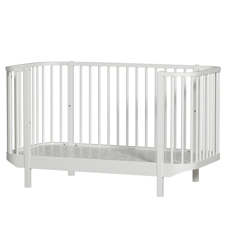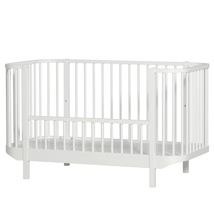 This beautiful Oliver Furniture Wood cot in new Nordic design has an inspiring contrast of Nordic oak with classic white lines, soft expression and innovative design. This clever cot has Five different functions so as the child grows that cot adapts. At the first stages you can have the base raised to allow for easy access to your new-born allowing a more ergonomic and closer contact between yourself and your baby and then as they start to sit up you can lower the base to the lower setting.