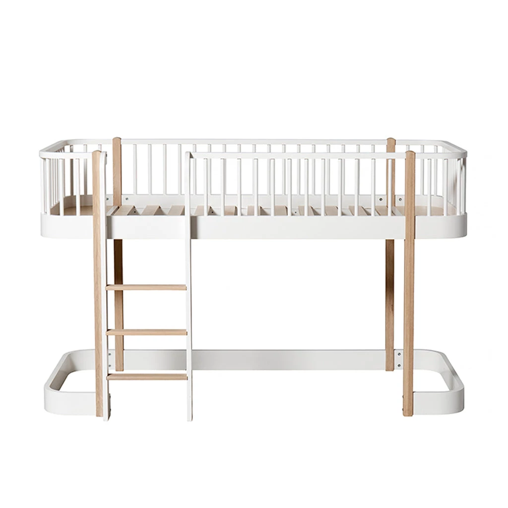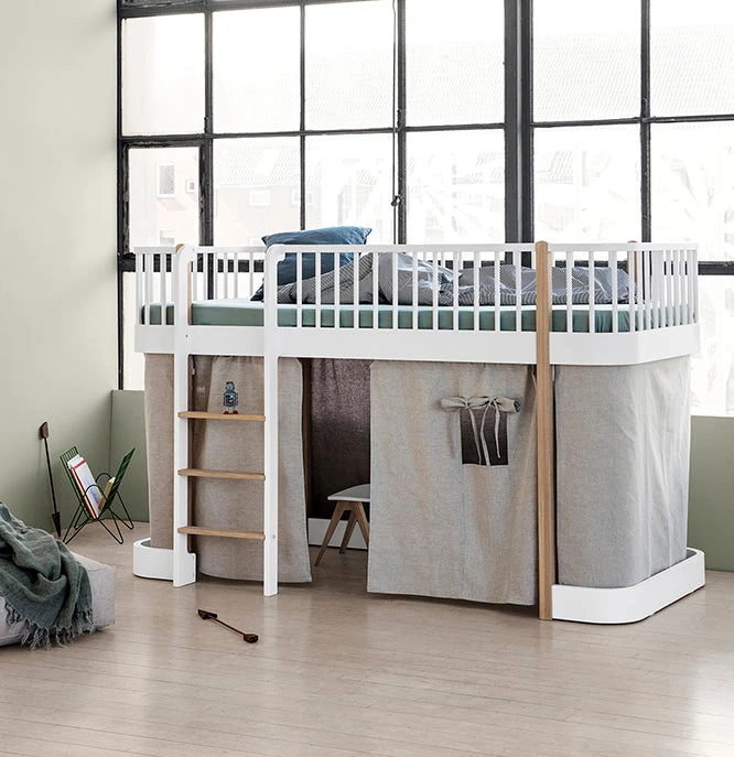 The Oliver furniture wood low loft bed is a unique way of meeting the child’s need of closeness, comfort and safety. The well-conceived design offers a ladder positioned on the front and space under the bunk for your child to create a cosy hangout by simply adding their additional curtain to create a cool den .