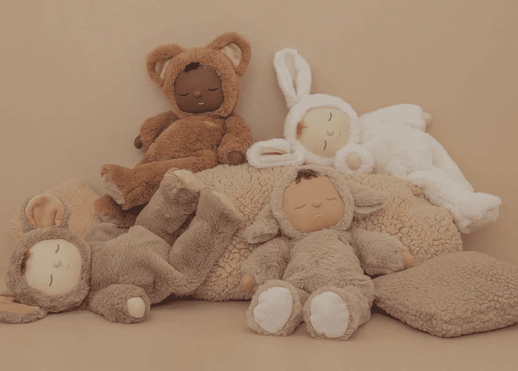 - Dozy Dinkums wear a non-removable plush onesie with ears & an embroidered rainbow on heart area.