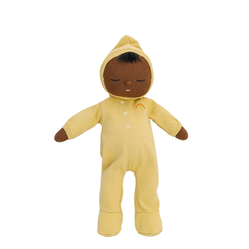 Like all the Dozy Dinkums from Olli Ella, Mini is posable, made from the softest cotton outer, and is the perfect first toy and keepsake. Mini features the sweetest embroidered face with a tuft of hair and wears a non-removable onesie with a rainbow over the heart.