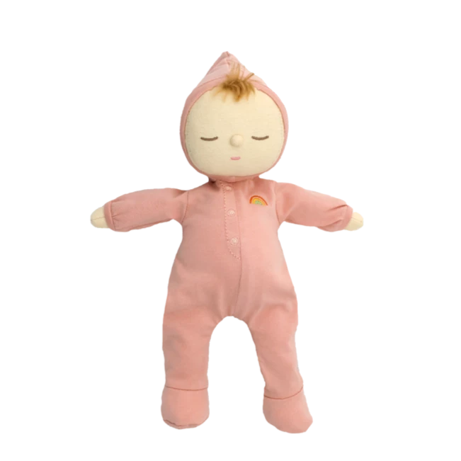 Like all the Dozy Dinkums from Olli Ella, Moppet is posable, made from the softest cotton outer, and is the perfect first toy and keepsake. Moppet features the sweetest embroidered face with a tuft of hair and wears a non-removable onesie with a rainbow over the heart.