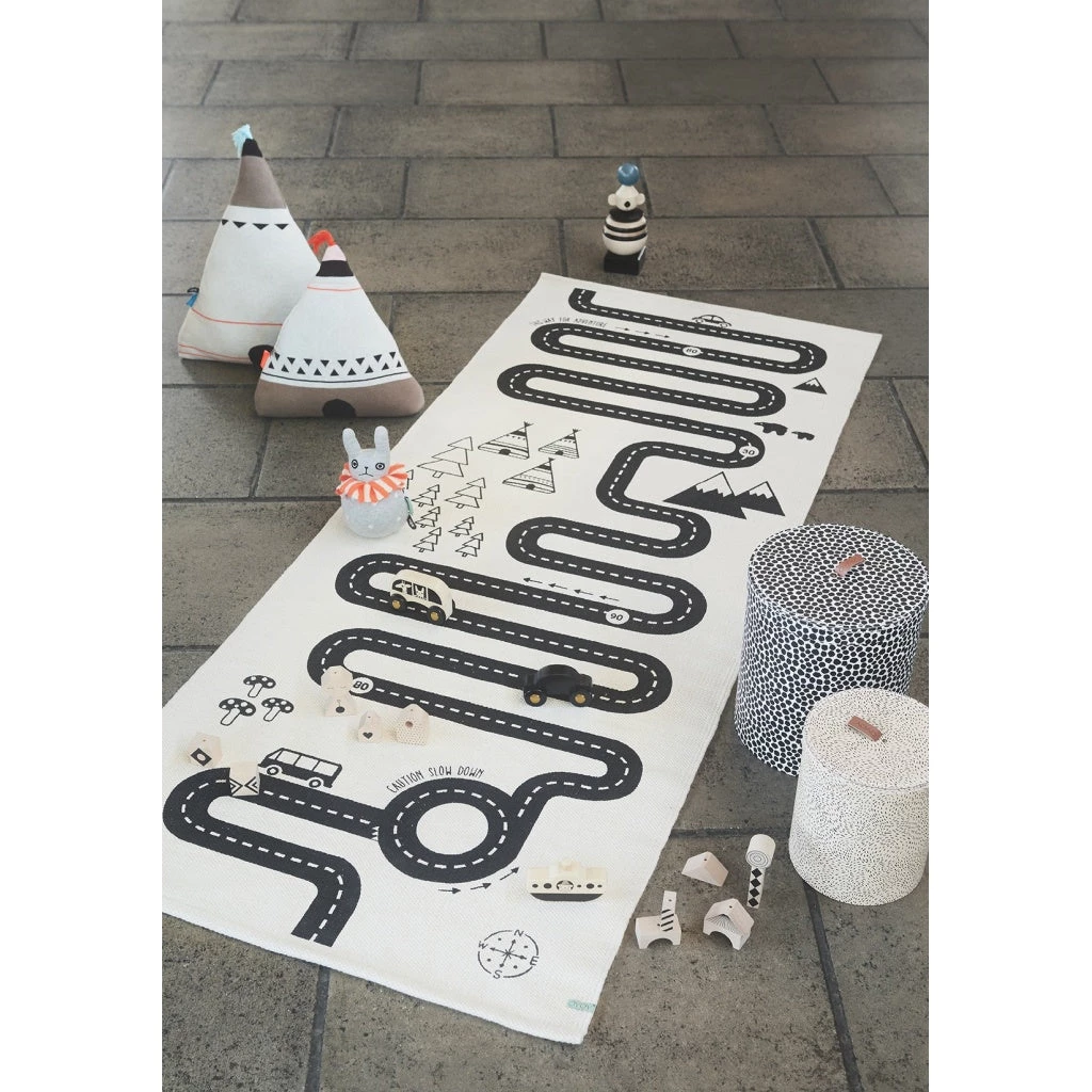 Get ready for a road trip with this adorable adventure rug from OYOY design & living. The rug is made of 100% cotton and has a hand-printed design of a road with little surprises along the way. A great addition to any kid’s room or playroom!