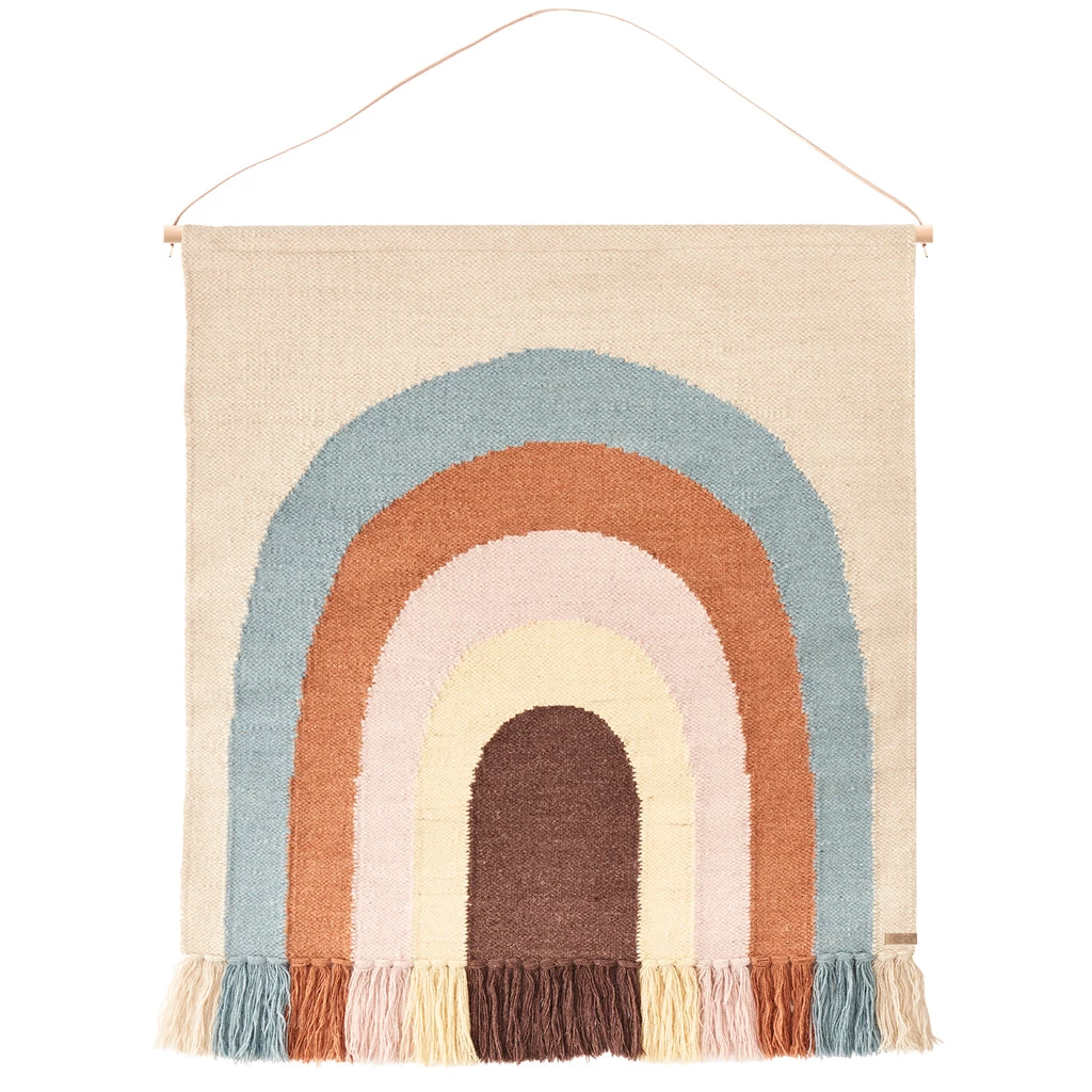 The OYOY Follow The Rainbow Rug appears both cute and playful. The rug illustrates a multi-coloured rainbow and is made of 80% wool and 20% cotton.