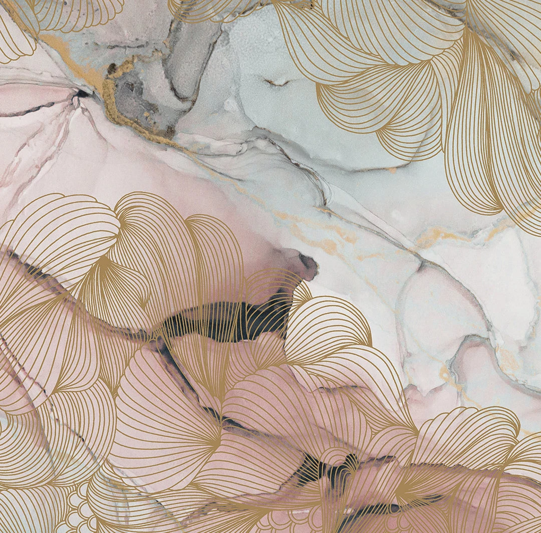 Marble has been frequently used in ornaments all over the world for thousands of years. This material has a luxurious flair, adorned both in rooms and activities that strive for that feeling. The color scheme of this stunning wall mural is based on light gray, apricot, peach and gold.