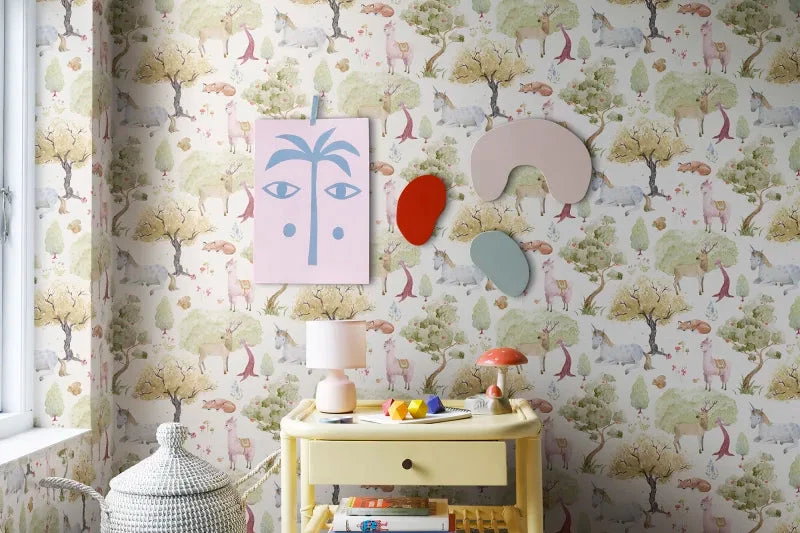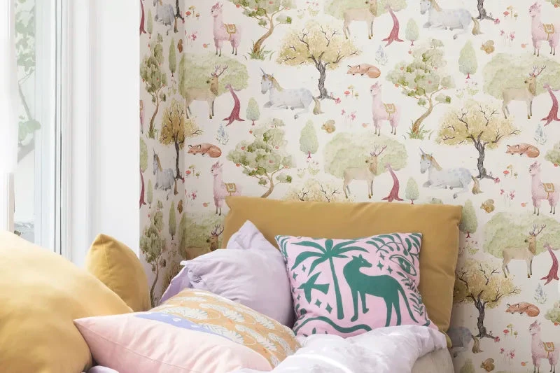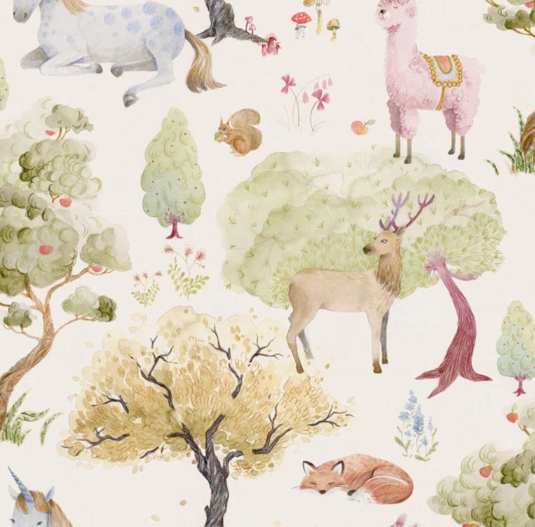 Dream of enchanted forest glades where rain glitters and spectacular rainbows are possible! Dreamland, here in the colorway sand, portrays sparkling unicorns, fluffy alpacas, and snoozing foxes.