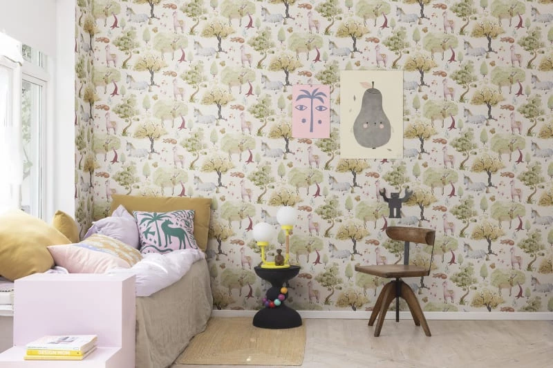 - Printed with all natural non-toxic color compounds that produce no VOC and the wallpaper paste is made from modified potato starch that is also non-toxic.