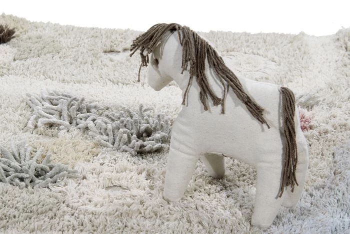 The most iconic piece in the collection is a washable play rug! It is covered in intricate details that mimic the textures of the forest, creating an authentic miniature landscape. Its irregular border, the yarn melange, the new tufting techniques and different pile heights applied, provide a 3D effect on the rug’s surface for children to bring it to life along with the little cuddly cotton horse cushion, included with the rug.