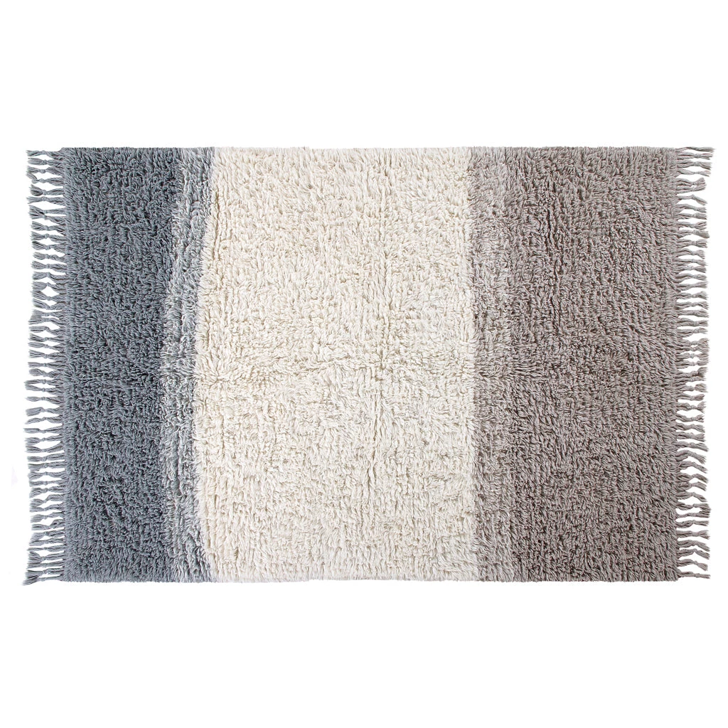 Rectangular wool rug in soft colors shades of Smoke Blue, Natural and Silver Gray. Basic bohemian styled rug that will bring coziness to the environment. Finished with handmade cross-knotted wool fringes at edges.